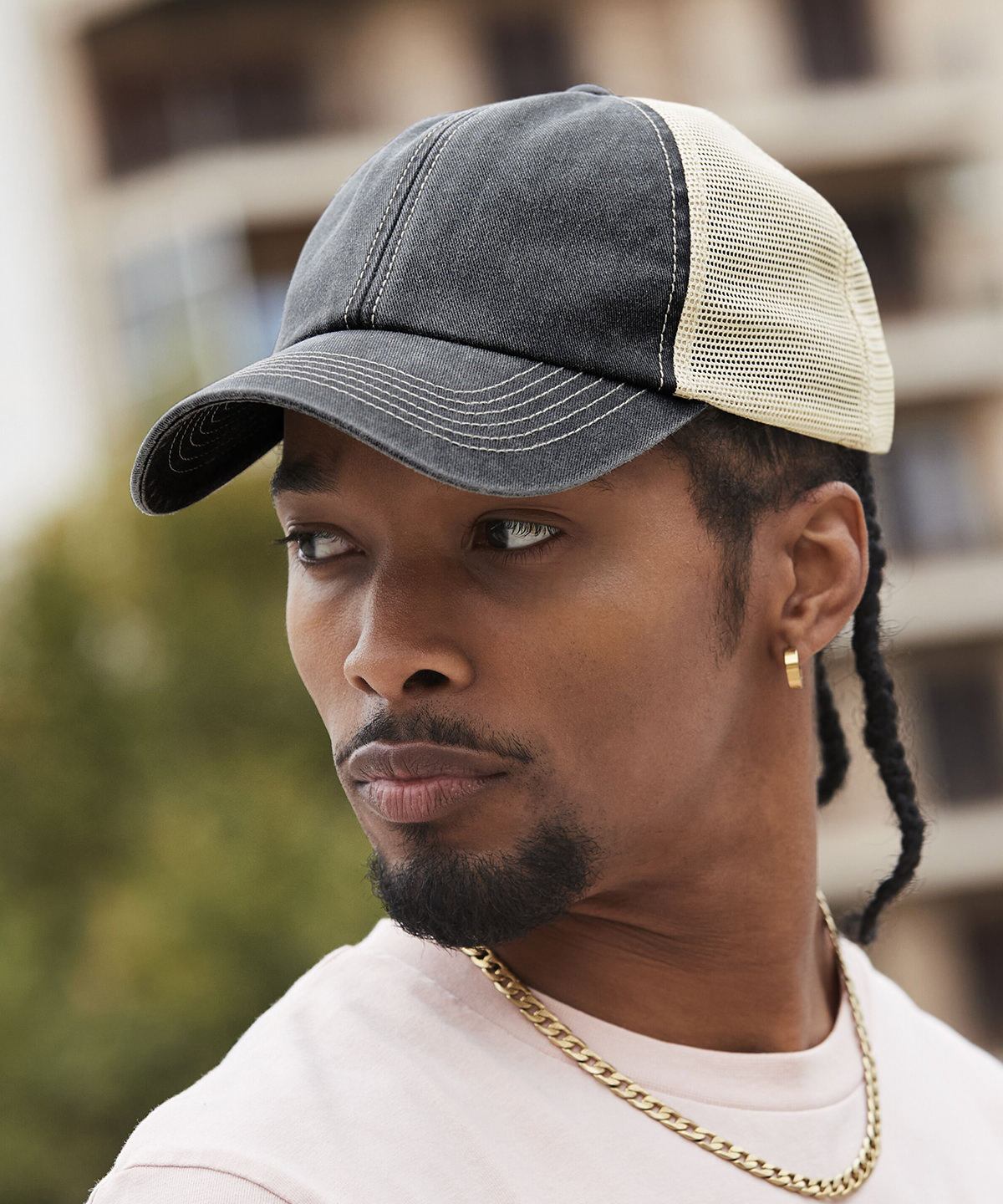 100% Heavy washed cotton. 100% Recycled polyester mesh rear panels